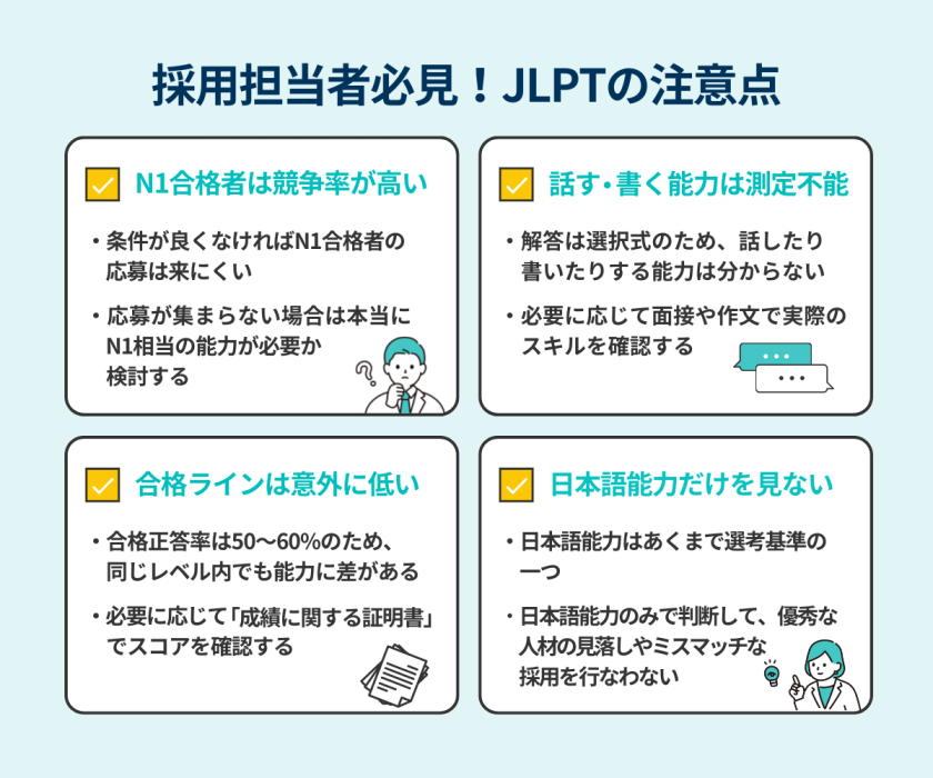 ここでは日本語能力試験の結果を選考に取り入れる際に覚えておくべきポイントを解説します。