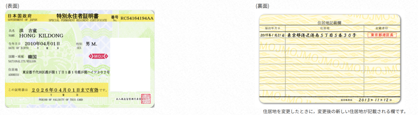 特別永住者証明書の記載項目は以下のとおりです。